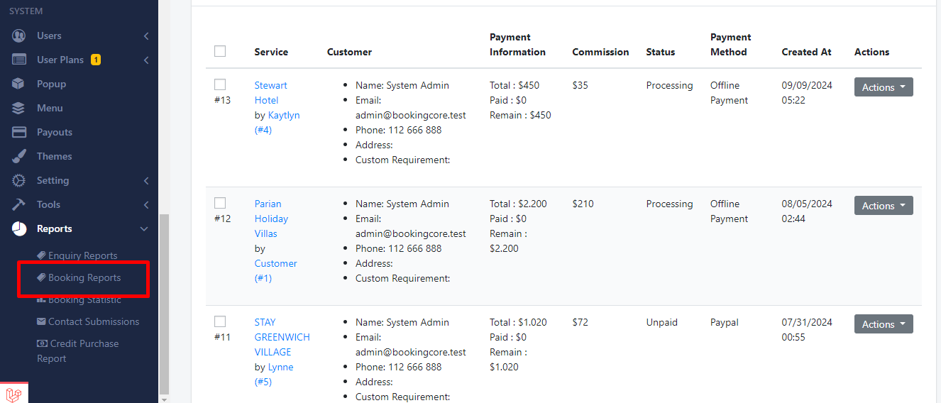 Neste painelestá listado no Relatório de reserva, você pode gerenciar os detalhes do pedido facilmente. Todas as informações de pagamento, como total, pago, restante ou comissão, são salvas aqui. Pressione para detalhes para ver mais informações: