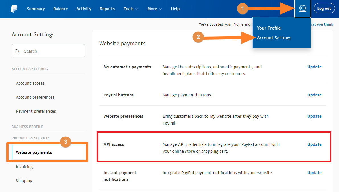 Configurações > Configurações da conta > Pagamentos do site em Produtos e serviços > Clique no link Atualizar em Acesso à API.