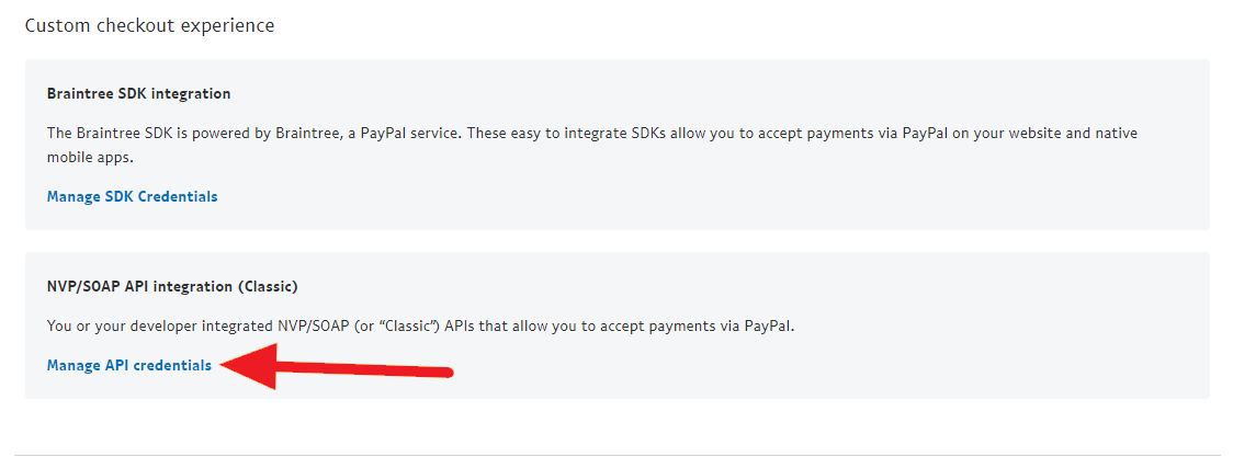3. Na seção Experiência de checkout personalizada, clique no link Gerenciar credenciais de API na opção Integração de API NVP/SOAP (Clássica):