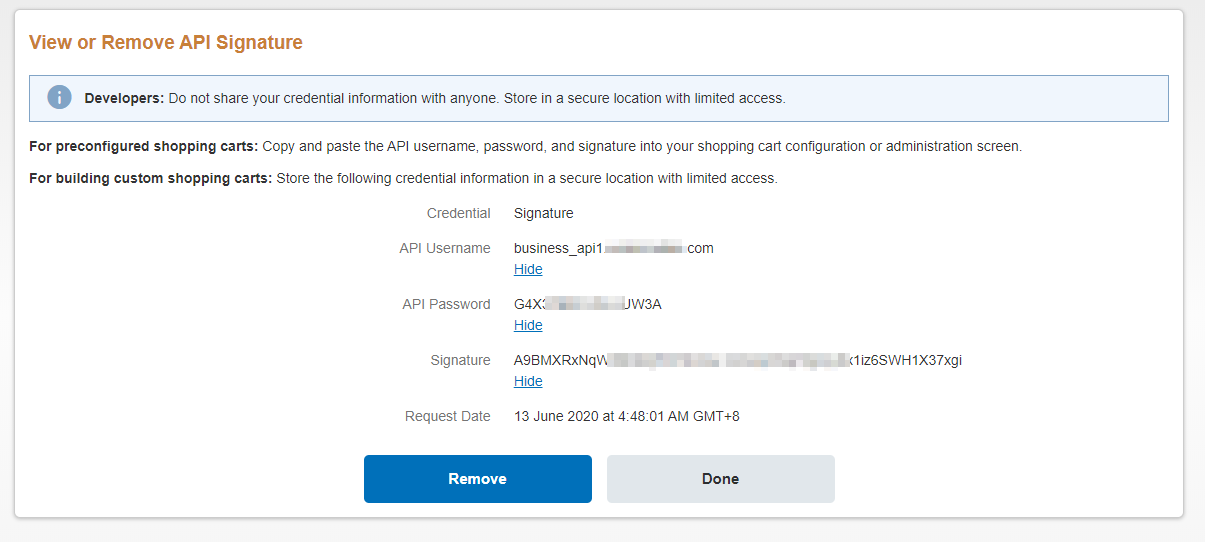 Na próxima página, copie o nome de usuário, senha e assinatura da API gerados. Clique no botão Concluído se tiver terminado.