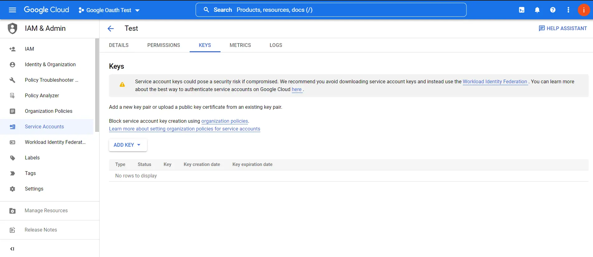 5. Na guia de chaves da sua conta de serviço recém-criada, clique no botão adicionar chave e escolha a opção JSON