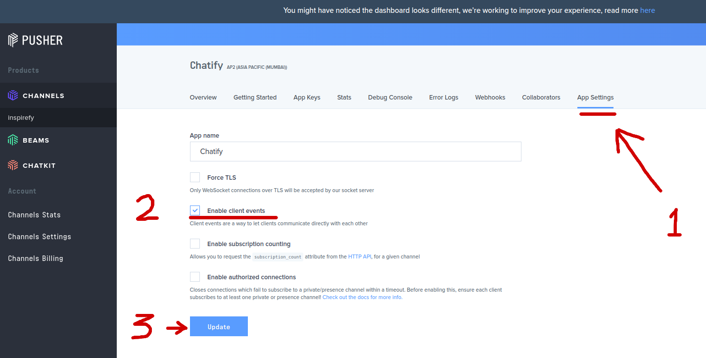 Este pacote usava eventos de cliente Pusher e os eventos de cliente devem ser habilitados para o aplicativo. Você pode fazer isso na guia Configurações do seu aplicativo no painel Canais.