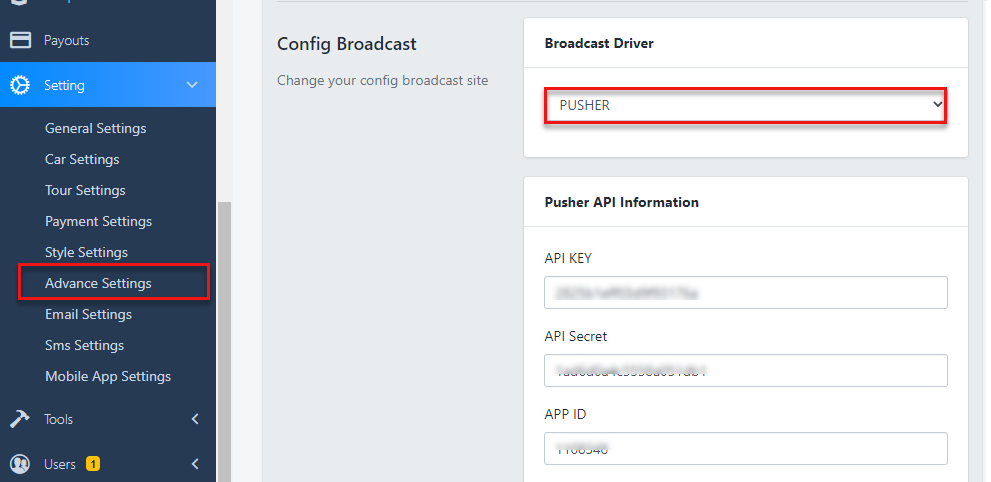 A próxima etapa é inserir o código da API Pusher noPainel > Configurações > Configurações avançadas > Transmissão de configuração > Pusher: