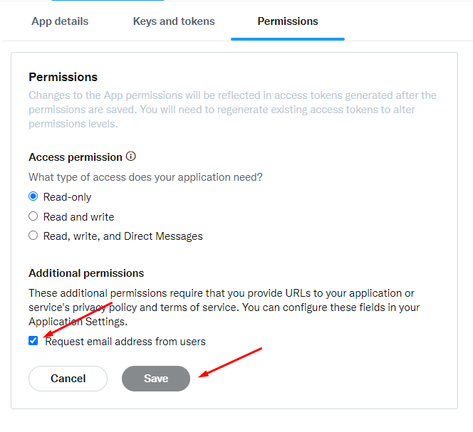 4. Nas permissões adicionais, marque a opção "Solicitar endereço de e-mail dos usuários"