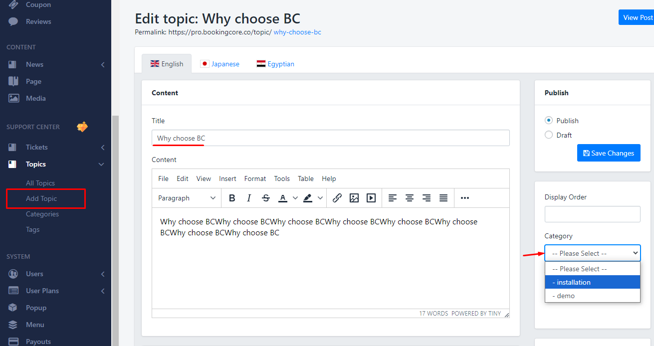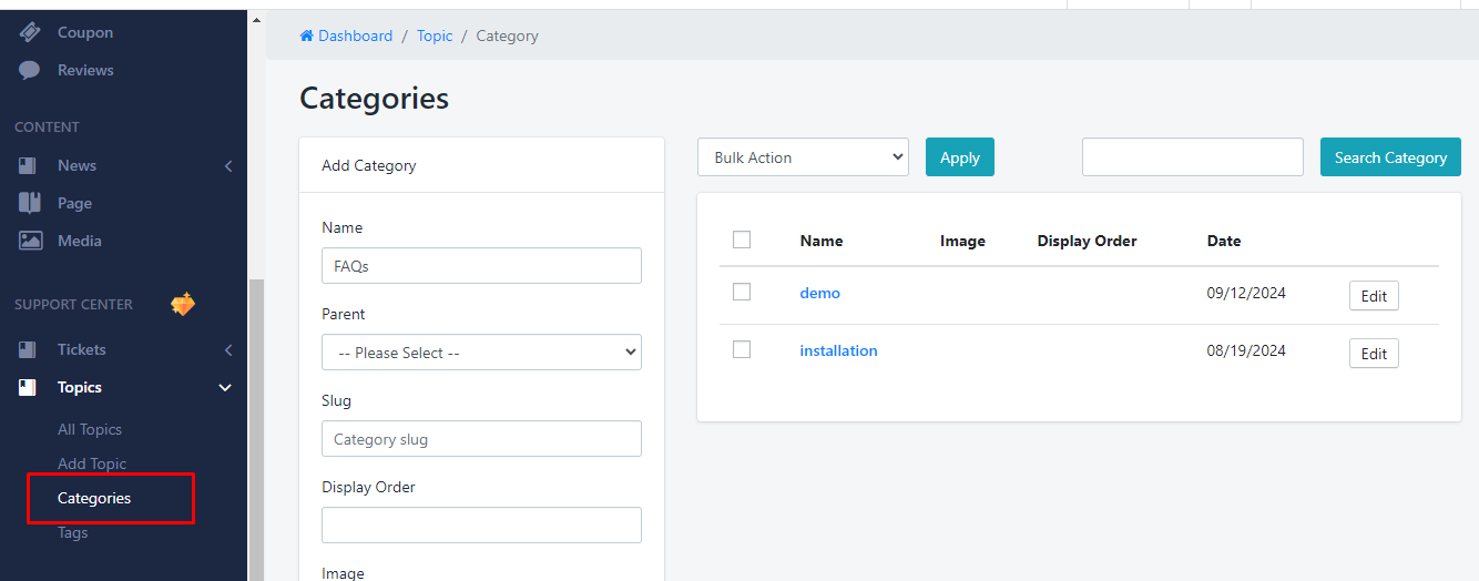 Passo 1: Crie uma categoria:Insira o nome da categoria do tópico na coluna da direita