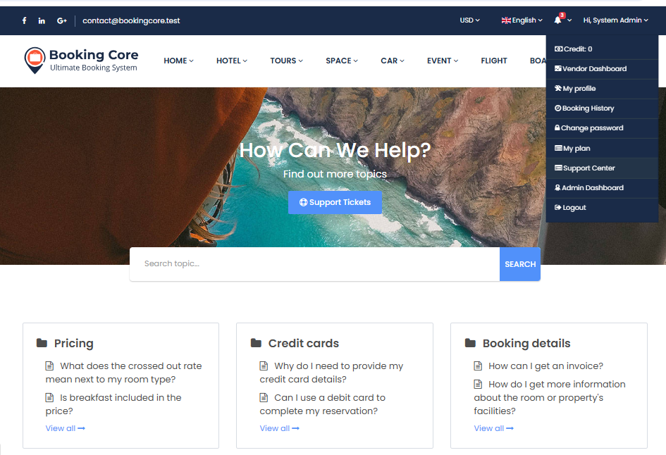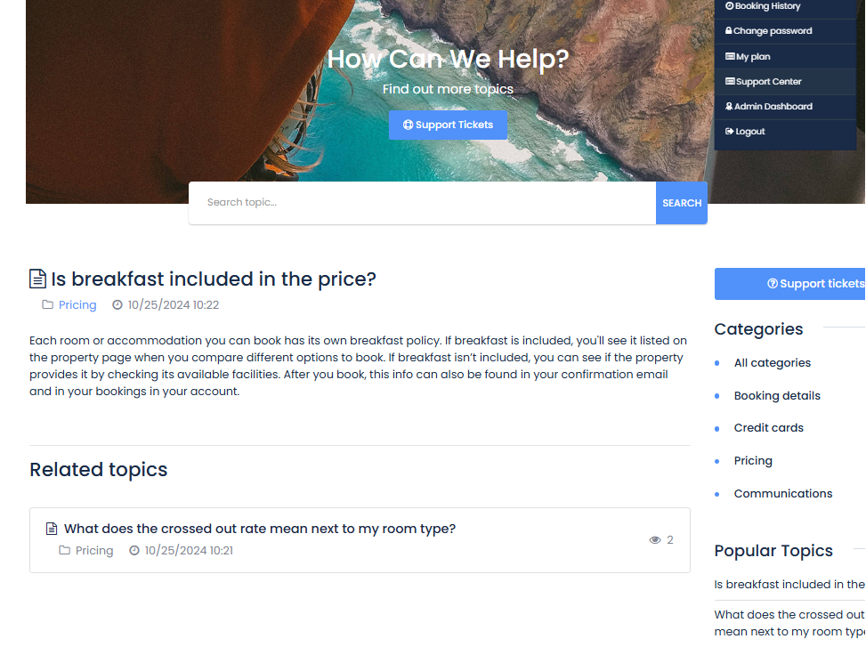 No menu Admin > Centro de suporte,Aqui os usuários podem obter respostas para todas as perguntas sobre reservas, pagamentos, preços...