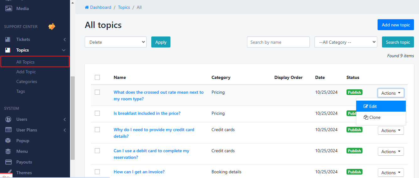 No Painel, vá para Centro de Suporte > Tópicos,Você pode editar/clonar/excluir o tópico que não precisa usar: