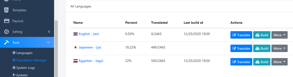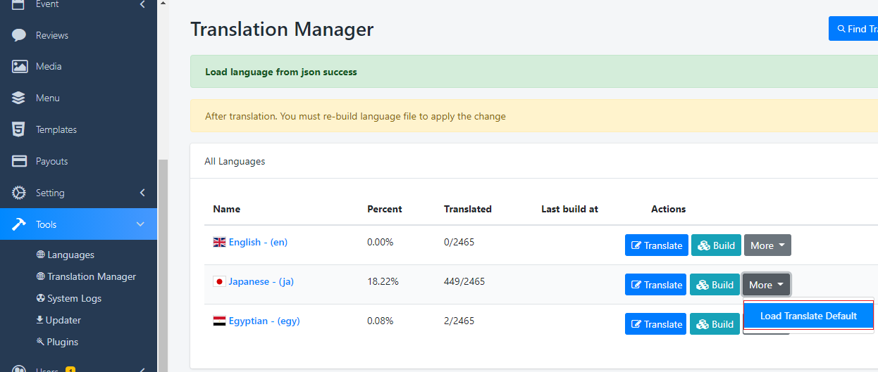 No painel de administraçãoFerramentas > Gerenciador de Tradução, para carregar o texto doArquivo JSON, o primeiro passo que você precisa fazer é"Mais > Carregar padrão traduzido"