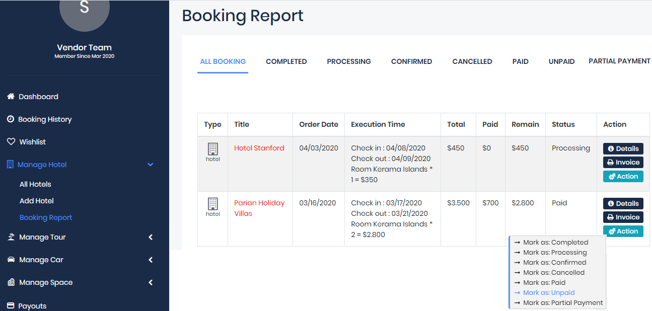 - PAGO: exibe apenas oRelatório pago, este status será definido quando o pedido de reserva for pago via Paypal/PayStripe/TwoCheckout ou através de qualquer gateway de pagamento online