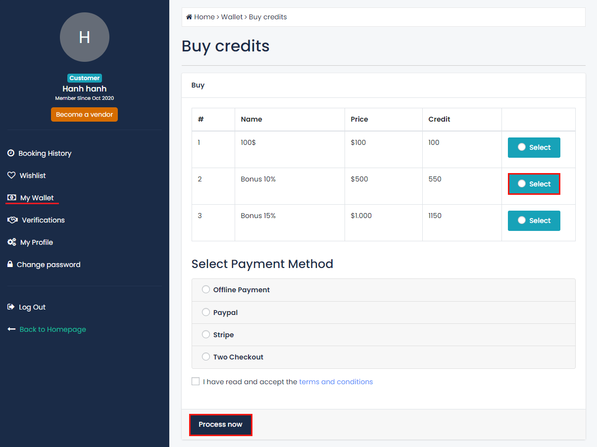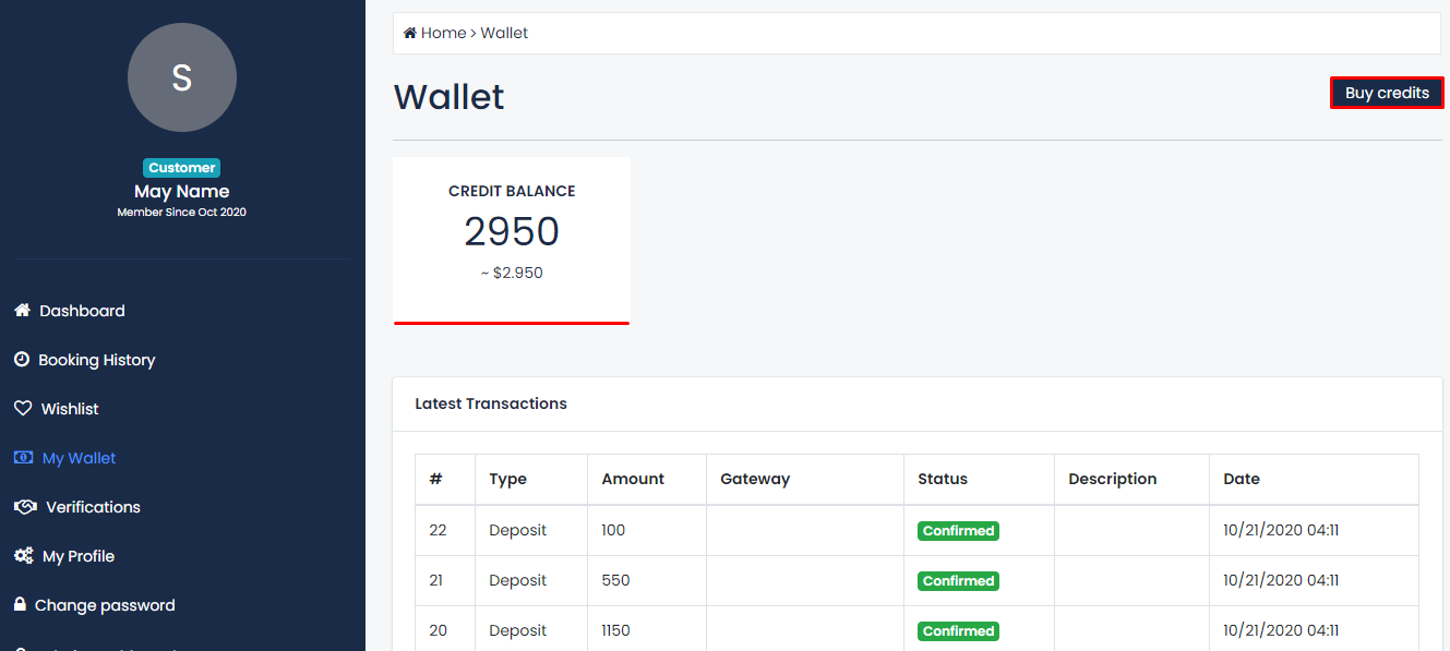 Após registrar uma conta, o cliente poderá ver o"Crédito"campo no menu Perfil. Desde o início, issosaldo é 0. O cliente pode utilizar este crédito para pagar o seu Pedido de Reserva.